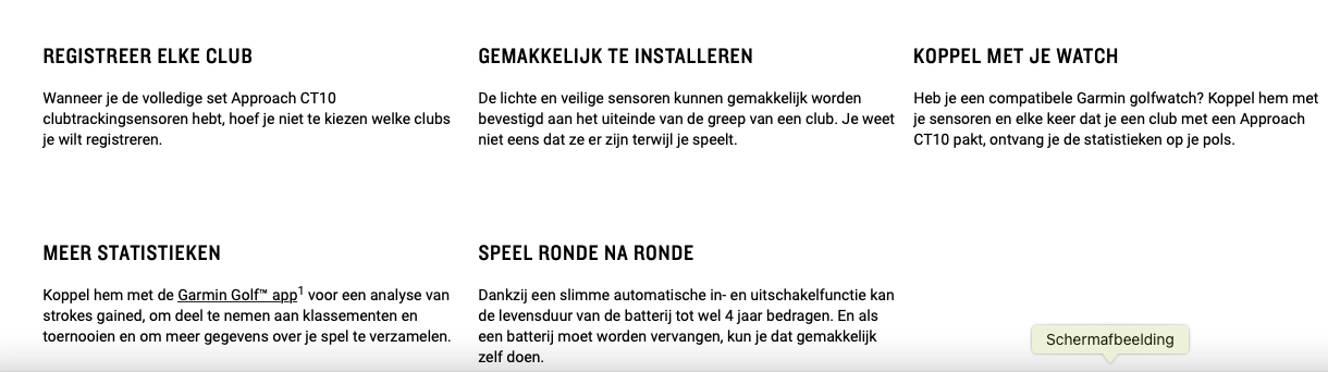 - Volledige of beginnersseet. Approach CT10 clubtrackers zijn verkrijgbaar in een volledige set waarmee u alle 14 clubs in uw tas kunt volgen of als beginnerset met 3 sensoren als aanvulling op uw AutoShot compatibele horloge.